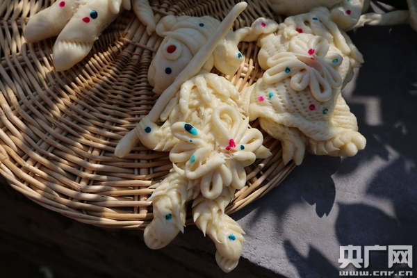 文化是相通的,除了捏面花,老人也經(jīng)常剪紙、繪畫。剪紙、繪畫作品里的靈感,又都會(huì)運(yùn)用在面花的創(chuàng)作中。在老人的家里,到處貼著剪紙,門上墻上,都掛著曬好的面花,老人告訴記者,自己今年已經(jīng)71歲了,眼睛也看不太清了,手也似乎沒勁了,要捏出一個(gè)自己中意的面花,很費(fèi)功夫。好在她經(jīng)常參加當(dāng)?shù)亟M織的面花傳承活動(dòng),有越來越多的人愛上捏面花,甚至有人經(jīng)常登門拜訪,這讓老人很是欣慰。