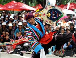倉(cāng)決:一說(shuō)到”拉姆”,人們以為我們很神氣。其實(shí)在舊西藏,我們跟乞丐差不了多少。有一首流傳很廣的民歌是這樣唱的:阿吉拉姆是仙女,仙女的粥是稀水。無(wú)須漢地的明鏡,粥里可照見身影。這是我們生活的真實(shí)寫照,F(xiàn)在,藏戲很受重視,政府扶持民間藏戲表演隊(duì),2001年我們覺木隆藏戲隊(duì)重新組建,我也加入了表演隊(duì),演出的道具、設(shè)備、環(huán)境等條件都好了,我很羨慕現(xiàn)在年輕的演員們。