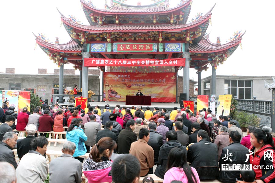 央廣網(wǎng)莆田2月25日消息(記者陳江南 何鵬)馬年正月,由中央人民廣播電臺(tái)與中國農(nóng)業(yè)銀行共同主辦的《廣播惠農(nóng)之十八屆三中全會(huì)精神宣講入鄉(xiāng)村》活動(dòng)繼續(xù)馬不停蹄,于2月25日至27日深入福建省莆田、泉州、漳州,相繼在荔城、惠安、漳浦三縣區(qū)的農(nóng)村舉辦宣講活動(dòng)。宣講活動(dòng)中,中國農(nóng)業(yè)科學(xué)院農(nóng)村經(jīng)濟(jì)與發(fā)展研究所所長(zhǎng)秦富結(jié)合農(nóng)民身邊的具體案例,結(jié)合中央經(jīng)濟(jì)工作會(huì)議、城鎮(zhèn)化工作會(huì)議和中央農(nóng)村工作會(huì)議精神,結(jié)合中央一號(hào)文件,詳細(xì)解釋了十八屆三中全會(huì)精神中關(guān)于土地流轉(zhuǎn)、宅基地轉(zhuǎn)讓、土地抵押貸款等與農(nóng)民生產(chǎn)生活利益相關(guān)的三農(nóng)政策,并對(duì)農(nóng)民和鄉(xiāng)鎮(zhèn)干部提出的問題和存在的困惑進(jìn)行了生動(dòng)、詳細(xì)的解答;顒(dòng)中,演藝明星們還為現(xiàn)場(chǎng)的農(nóng)民帶來了快板《十八屆三中全會(huì)開紅花》以及歌曲表演。