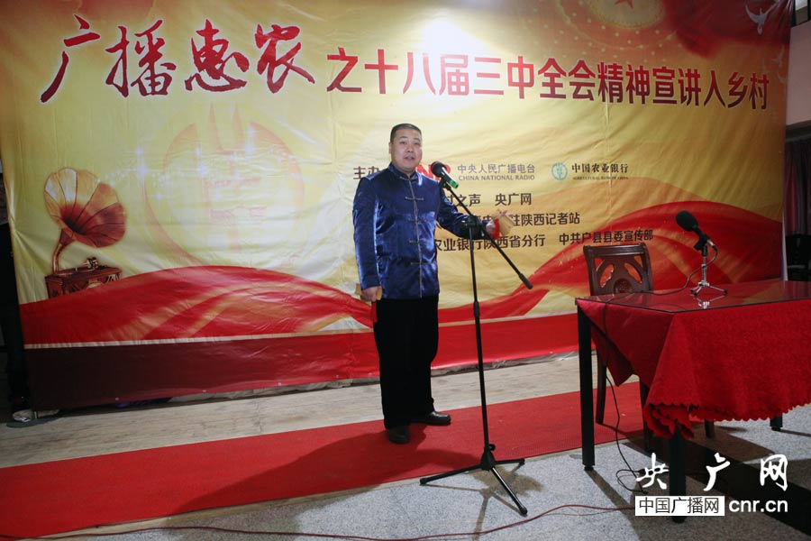 央廣網(wǎng)西安2月18日消息(記者陳江南 孟超 溫超 李偉民)2月18日上午,由中央人民廣播電臺、中國農(nóng)業(yè)銀行主辦、中國鄉(xiāng)村之聲、央廣網(wǎng)承辦的“廣播惠農(nóng)之十八屆三中全會(huì)精神宣講入鄉(xiāng)村”在陜西省的首場活動(dòng)在西安市戶縣甘河鎮(zhèn)拉開序幕。