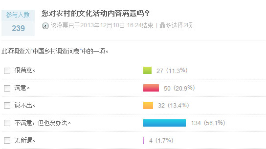 根據(jù)中國鄉(xiāng)村之聲在新浪微博發(fā)起的投票調(diào)查顯示,56.1%的網(wǎng)友對于自己所在村的文化活動內(nèi)容不滿意。