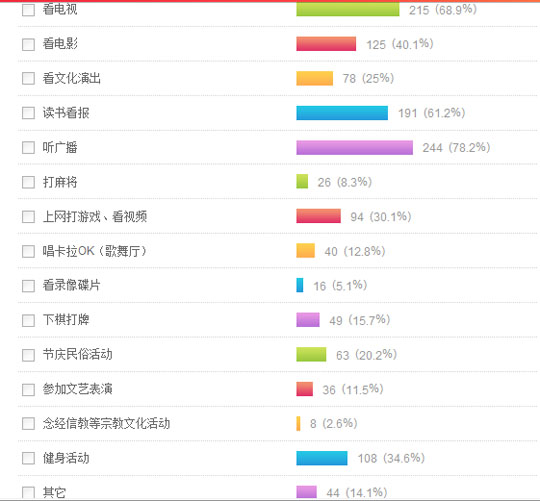根據(jù)中國鄉(xiāng)村之聲在新浪微博發(fā)起的投票調(diào)查顯示,56.1%的網(wǎng)友對(duì)于自己所在村的文化活動(dòng)內(nèi)容不滿意。