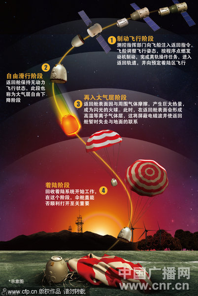 圖為神八返回的模擬圖。在與天宮一號(hào)順利完成兩次空間交會(huì)對(duì)接任務(wù)后,神舟八號(hào)飛船按計(jì)劃于17日返回地球。按照科學(xué)程序,飛船返回地面通常需要經(jīng)歷“四關(guān)”的考驗(yàn)。(圖片來源:CNR/CFP)