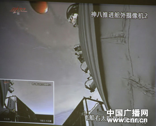 艙外攝像機(jī)拍到的推返分離實景(中廣網(wǎng)記者劉夢 攝)