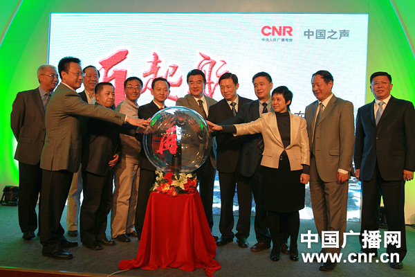 現(xiàn)場嘉賓共同啟動中國之聲“再起航”象征性標志(從左至右的嘉賓分別為:中央臺副總編輯劉曉龍,中央臺副臺長趙子忠,中央臺副臺長趙鐵騎,中國扶貧基金會秘書長劉文奎,全國道德模范“當代雷鋒”郭明義,廣電總局宣傳管理司副司長高長力,廣電總局黨組成員、中央臺黨組書記、臺長、王求,國務院新聞辦公室新聞局局長郭衛(wèi)民,北京師范大學公益研究院院長王振耀,中央臺副臺長趙忠穎,中央臺副總編輯杜嗣琨,中央臺副總編輯史敏)