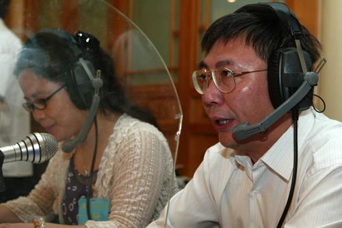 慶祝中國共產(chǎn)黨成立85周年暨總結保持共產(chǎn)黨員先進性教育活動大會,30日上午9時在中南海懷仁堂禮堂隆重舉行。胡錦濤、吳邦國、溫家寶、賈慶林、曾慶紅、黃菊、吳官正、李長春、羅干出席。中央人民廣播電臺中國之聲、中華之聲、華夏之聲對活動大會進行了現(xiàn)場直播。圖為中央臺播音員陸洋在直播現(xiàn)場。 中廣網(wǎng)記者李洪濤 攝