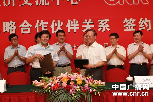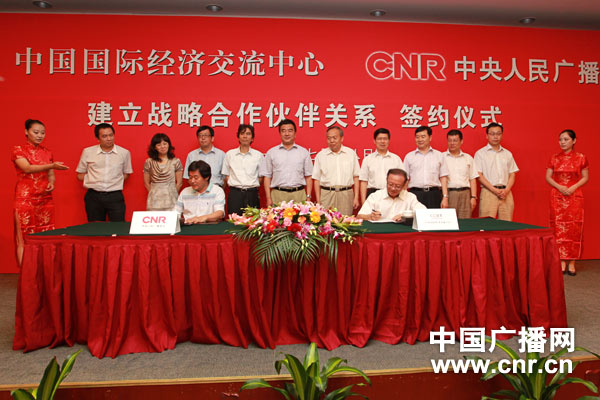 中國國際經(jīng)濟交流中心秘書長魏建國、中央人民廣播電臺副總編輯李國君簽署戰(zhàn)略合作協(xié)議(中廣網(wǎng)記者 涂傲 攝)