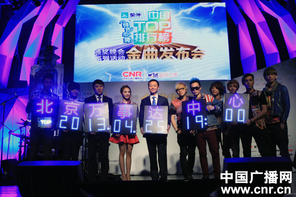中國top排行榜頒獎晚會于4月25日晚在北京萬事達中心舉行。就在晚會舉行的幾天前,4月20日8時02分,四川省雅安市蘆山縣發(fā)生了7.0級強烈地震,災(zāi)情牽動全國人民的心,MusicRadio音樂之聲作出及時反應(yīng),將晚會主題定為“聚合音樂能量,傳遞雅安希望”,通過匯聚演藝明星和社會各界的愛心力量,一起為雅安祈福。