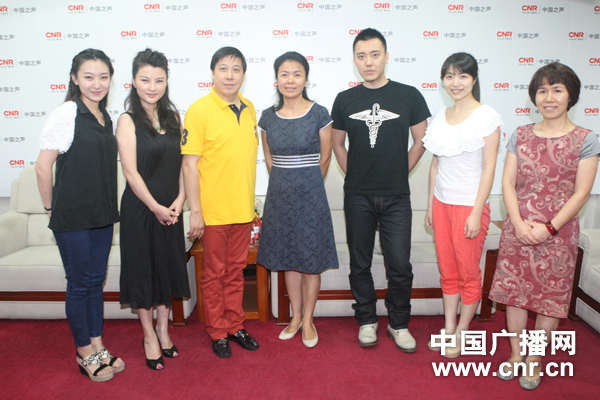 著名歌唱家魏金棟(左三)、青年歌手朱砂(左二)、獨(dú)唱演員岳璐(左一)與中國之聲直播工作人員合影(中廣網(wǎng)記者陳江南_攝)
