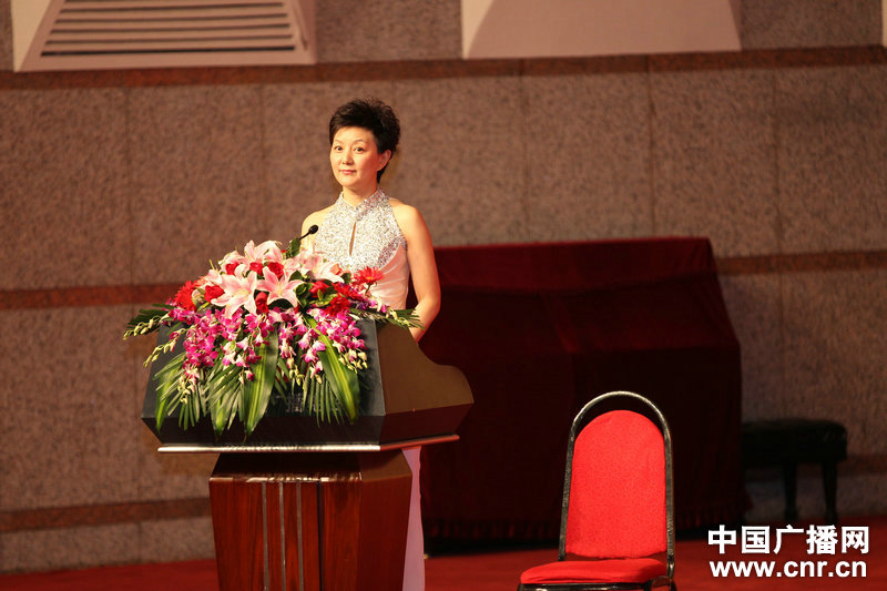 5月10日晚,中央人民廣播電臺音樂廳上演章紅艷彈撥組合音樂會,圖為章紅艷做開場發(fā)言。(中廣網(wǎng)記者張曈攝)