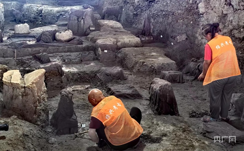工作人員在考古現(xiàn)場忙碌(央廣網(wǎng)見習記者 陳爽 攝)