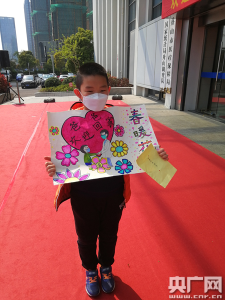 舟山第二小學(xué)三年級(jí)學(xué)生鄭子軒在得知援鄂醫(yī)療隊(duì)回家的消息后,今天自發(fā)地跟媽媽一起過(guò)來(lái)迎接戰(zhàn)疫的英雄們,還特地畫了一幅畫!笆迨灏⒁虃兎浅S赂遥芫磁逅麄,我長(zhǎng)大后一定要向他們學(xué)習(xí)。”