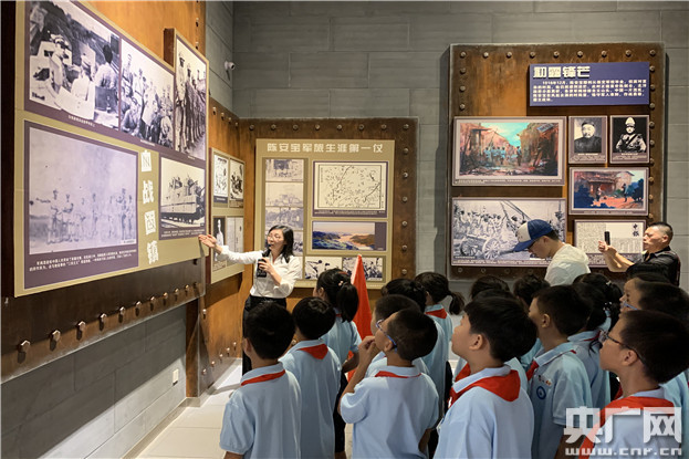在紀(jì)念館內(nèi),講解員為孩子們講述了陳安寶烈士“取義成仁,為國捐軀”的革命事跡。一張張圖片,一件件物品,還有20分鐘的幻影成像片《陳安寶的一生》,讓孩子們對陳安寶這位抗日民族英雄的革命事跡有了更深入的了解。