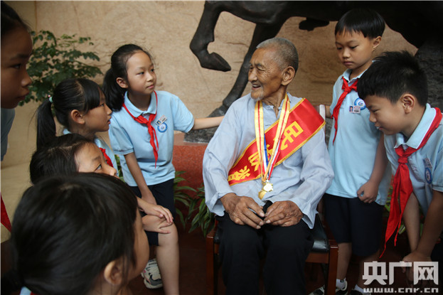 今年101歲的百歲抗戰(zhàn)老兵王才通今天也在志愿者的陪同下,從黃巖老家來到紀(jì)念館,專程緬懷老軍長。他和學(xué)生們向陳安寶烈士的雕塑莊重地敬禮。1939年20歲的王才通抽丁入伍,參加了南昌戰(zhàn)役和后來慘烈的上高會戰(zhàn),抗戰(zhàn)四年返回老家,2015年9月3號他榮獲中共中央,國務(wù)院、中央軍委頒發(fā)的紀(jì)念抗日戰(zhàn)爭勝利七十周年紀(jì)念章。
