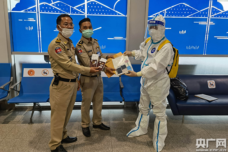 在柬埔寨金邊機(jī)場(chǎng),民警與柬埔寨方面工作人員交接黑惡目標(biāo)逃犯。(央廣網(wǎng)發(fā) 通訊員陳建波 攝影)