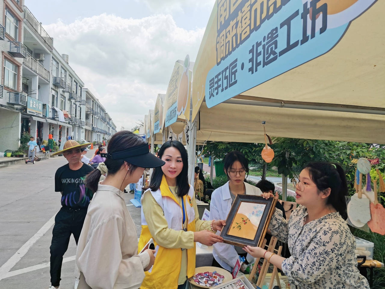章云燕在小稠村市集活動現(xiàn)場向游客推介非遺作品(桐嶼街道辦事處供圖)