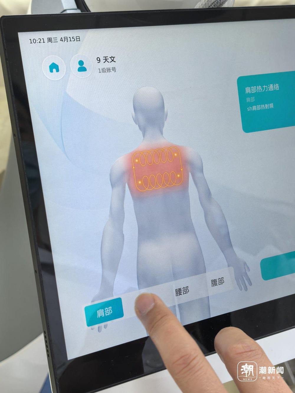 4月14日上午,九堡街道社區(qū)衛(wèi)生服務中心新開辟的“AI理療室”內(nèi),健身愛好者張師傅正在體驗“靈樞”的“零壓波理療”功能。