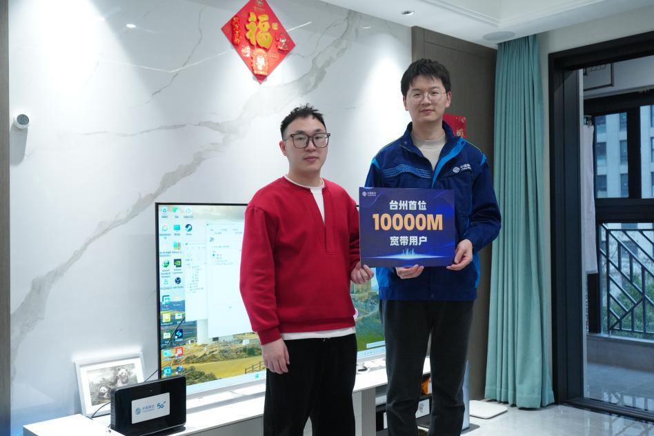 在臺州首位萬兆家庭寬帶用戶家中,網(wǎng)絡(luò)測速軟件顯示,寬帶實(shí)時測速達(dá)到9961Mbps的下載速率(中國移動浙江公司供圖)