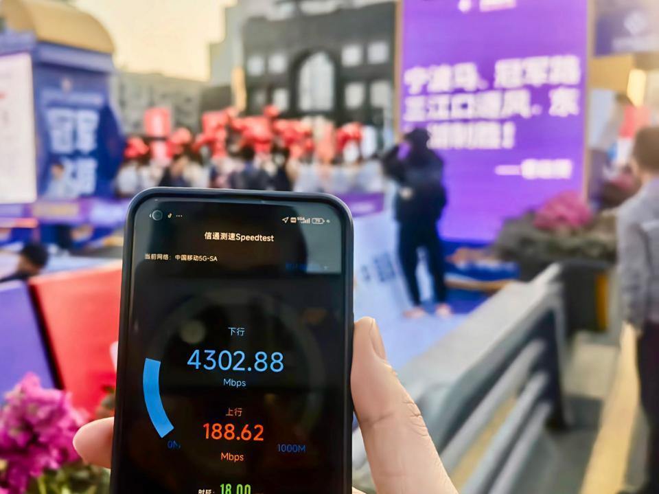 省內(nèi)移動用戶可以在杭州多個重點(diǎn)區(qū)域以及各地市重要場景體驗(yàn)到5G-A網(wǎng)絡(luò),經(jīng)實(shí)測5G-A下行峰值速率達(dá)4Gbps(中國移動浙江公司供圖)