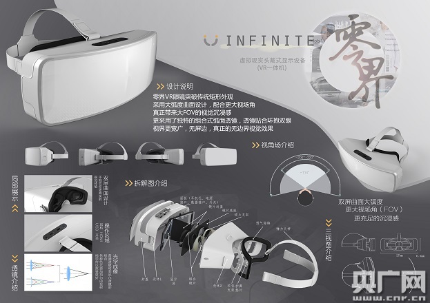 在大賽現(xiàn)場,記者見到了一款用3D打印技術(shù)制作的虛擬現(xiàn)實(shí)頭盔式顯示設(shè)備,該款名為“零界VR眼鏡”的設(shè)備作品是杭州職業(yè)技術(shù)學(xué)院工業(yè)設(shè)計(jì)專業(yè)的大三學(xué)生吳佳俊和他的團(tuán)隊(duì)制作的,該參賽作品已經(jīng)順利入選此次3D打印大賽的決賽環(huán)節(jié)!拔覀冞@款自主研發(fā)的產(chǎn)品理念是重新定義虛擬與現(xiàn)實(shí),它有獨(dú)特的光學(xué)結(jié)構(gòu),鏡片由菲涅爾材料以及曲面光學(xué)透鏡組成,從而營造一種視覺沉浸感。在基于創(chuàng)新設(shè)計(jì)和光學(xué)計(jì)算的基礎(chǔ)上,最后達(dá)到了180度以上的視野包裹效果,這和市面上傳統(tǒng)的100度的視野包裹的VR眼鏡有本質(zhì)區(qū)別”,吳佳俊介紹道。
