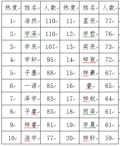 基于2018年落戶新生男寶的數(shù)據(jù),排名第一的“浩然”占新生男寶名字的0.22% ,排名第二的“宇澤”占0.22% ,排名第三的“宇辰”占0.21% 。