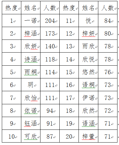 基于2018年落戶新生女寶的數(shù)據(jù),排名第一的“一諾”占新生女寶名字的0.44% ,排名第二的“梓涵”占0.37% ,排名第三的“欣妍”占0.30% 。