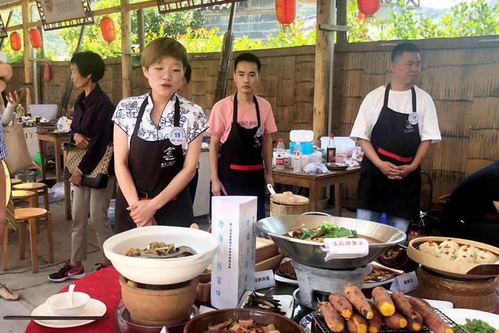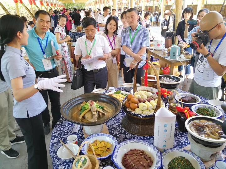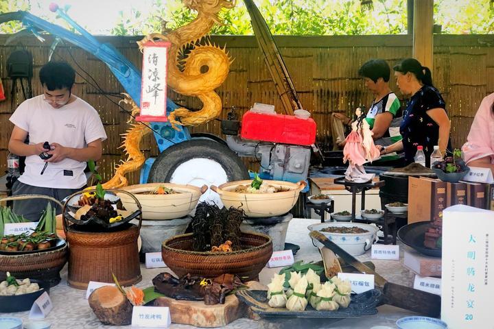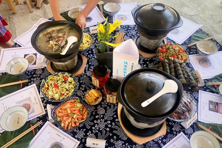 粽葉蒸土雞、老鴨燉石筍干、紫蘇小溪魚、梅干菜扣肉、豬藤吊蒸火腿肉……18道色香味俱全的佳肴引得游人垂涎三尺。