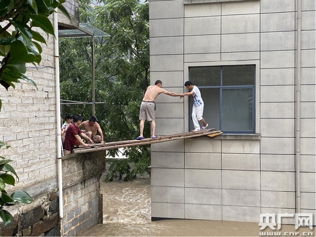 “抓住我的手!慢點(diǎn)走!”8點(diǎn)55分,在宋村鄉(xiāng)鏡洪村,村干部架起一座簡(jiǎn)易橋,接出了被洪水困在家里的農(nóng)戶(hù)張中華。原來(lái),張中華的房子地勢(shì)比較低,早晨一覺(jué)醒來(lái)就發(fā)現(xiàn)被洪水包圍了。鄉(xiāng)里包村干部和村里干部獲悉后,迅速抵達(dá)現(xiàn)場(chǎng)接應(yīng)。很快,村書(shū)記張三木和村委主任張紅鳳找來(lái)幾根木頭,大家在隔壁房子里架出一座橋,搭在張中華房子的窗戶(hù)口,幾名熱心的村民更是光著膀子上陣攙扶,最終將張中華接出了被困房屋。