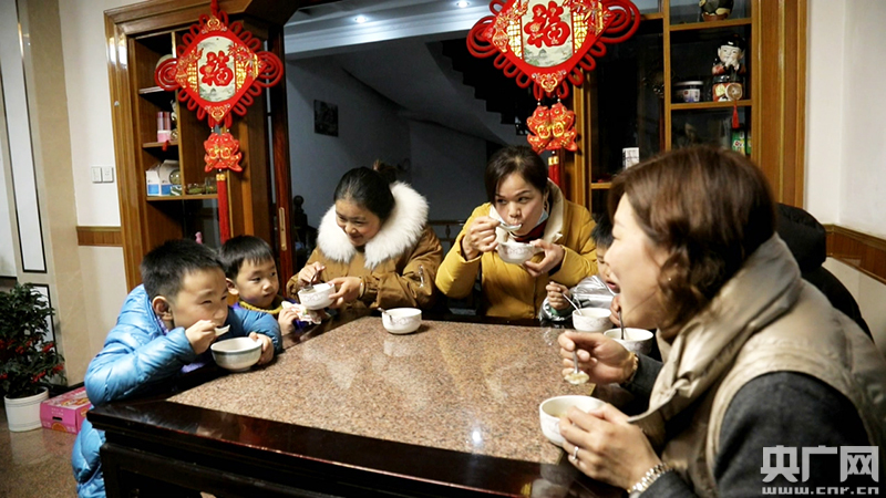 剛出鍋的鑊糍,稍稍冷卻后,加糖沖泡,便成了一碗香噴噴的“鑊糍湯”。來(lái)自山東棗莊的王景景,租住在村里已經(jīng)三年多了,今年第一次留在雙陳村和村民們一起過(guò)大年!八麄兲珶崆榱,感覺(jué)就像家人一樣。知道我們不回家,親人也不在身邊,讓我們到家里來(lái)一起過(guò)小年。我們那里都是包水餃,跟他們這里有點(diǎn)不一樣,但過(guò)年的氛圍是一樣的,都挺開(kāi)心,挺熱鬧的!