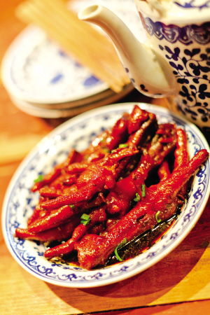 (點(diǎn)評(píng):一道成功的鳳爪,色澤酥紅晶亮,飽含黏稠的肉汁,僅是觀其形色,就已令人食指大動(dòng)。入口輕輕一抿,骨肉立即分離。為什么那么多姑娘愛(ài)吃這里的雞爪,秘密是這里面還放入了蜂蜜。用蜂蜜代替白糖,雖然成本上升了不少,但可以讓雞爪外表光鮮亮麗,嘗起來(lái)不但不油膩,還會(huì)有甘甜順口的滋味。)