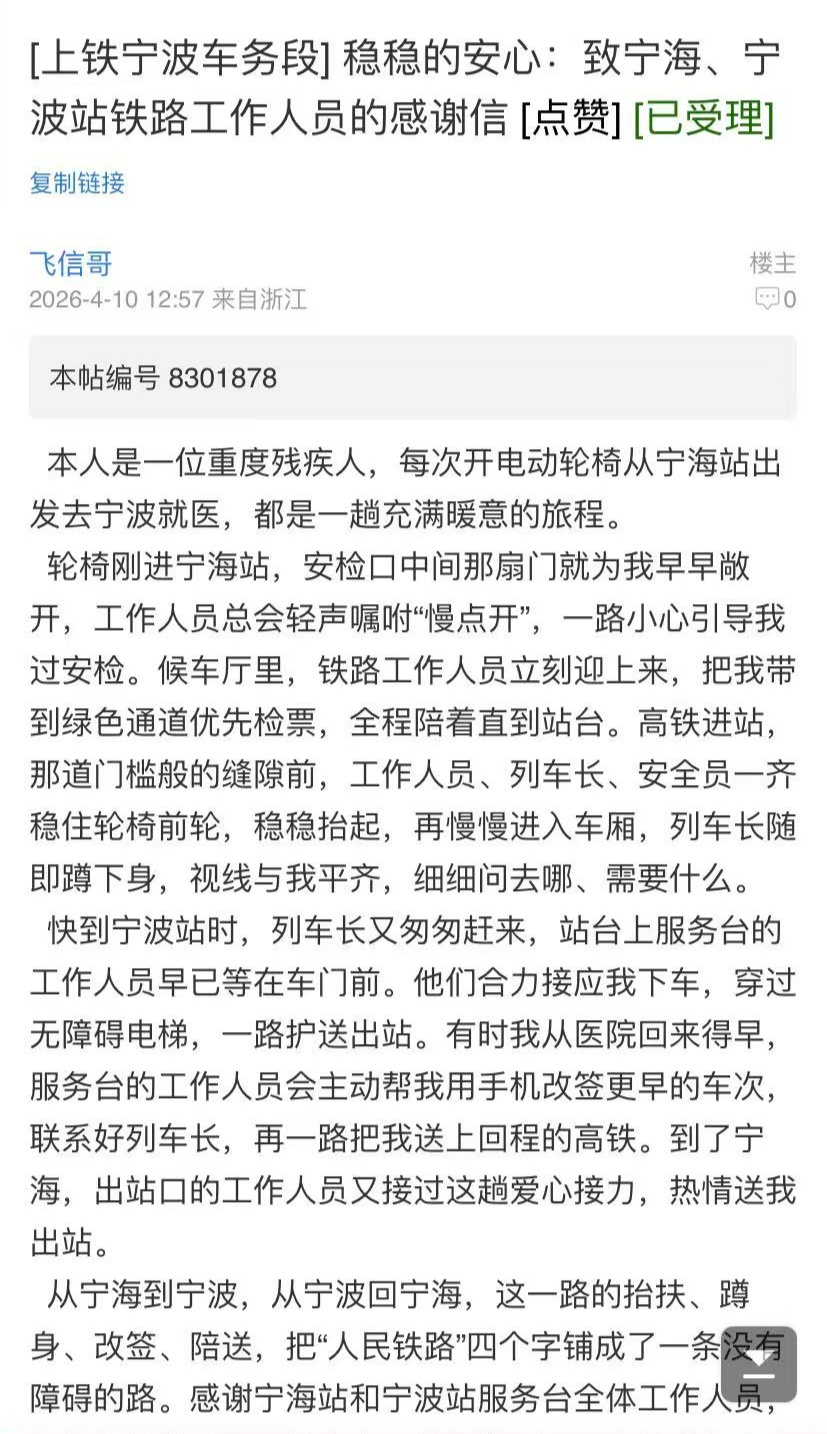對于行動不便的旅客而言,每一次出行都是一場考驗,而這位旅客卻在日復(fù)一日的往返中,收獲了滿滿的感動。每天清晨或午后,當(dāng)他抵達寧波站,服務(wù)臺的工作人員總是早已做好準備。從熱情的問候到細致的協(xié)助,從引導(dǎo)進站到安全護送上車,每一個環(huán)節(jié)都井然有序,卻又充滿溫情。
