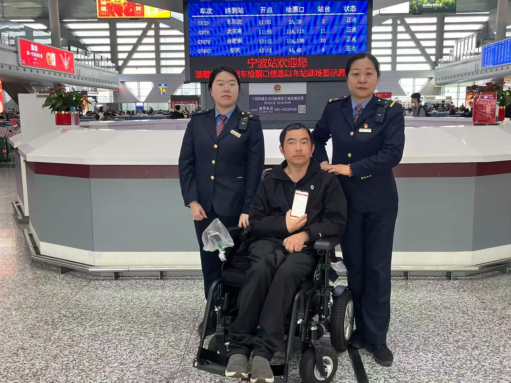 寧波站服務(wù)臺工作人員與該旅客合影(央廣網(wǎng)發(fā) 寧波火車站供圖)