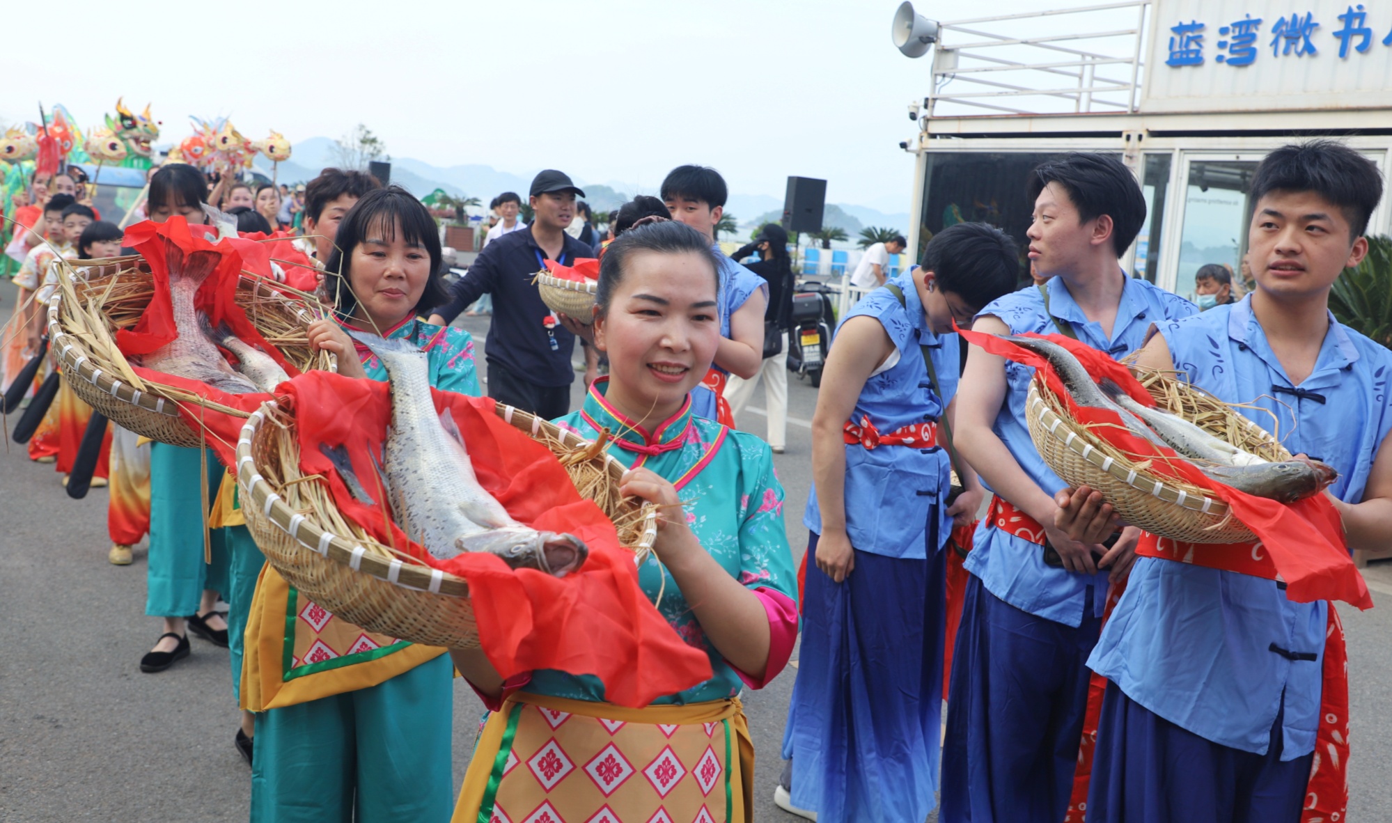 巡游隊伍中,最吸睛的當(dāng)屬漁獲展示隊。漁哥漁嫂們肩挎魚簍,手捧剛上岸的海釣鱸魚、鯔魚、銅盆魚等漁獲,銀光閃閃、活蹦亂跳!斑@條大魚怕有十幾斤嘞!”圍觀游客忍不住上前比劃贊嘆。漁嫂們大方熱情,邊走邊吆喝:“新鮮海釣魚,今晚就上桌!”引得眾人紛紛駐足,舉起手機定格這鮮活的畫面。