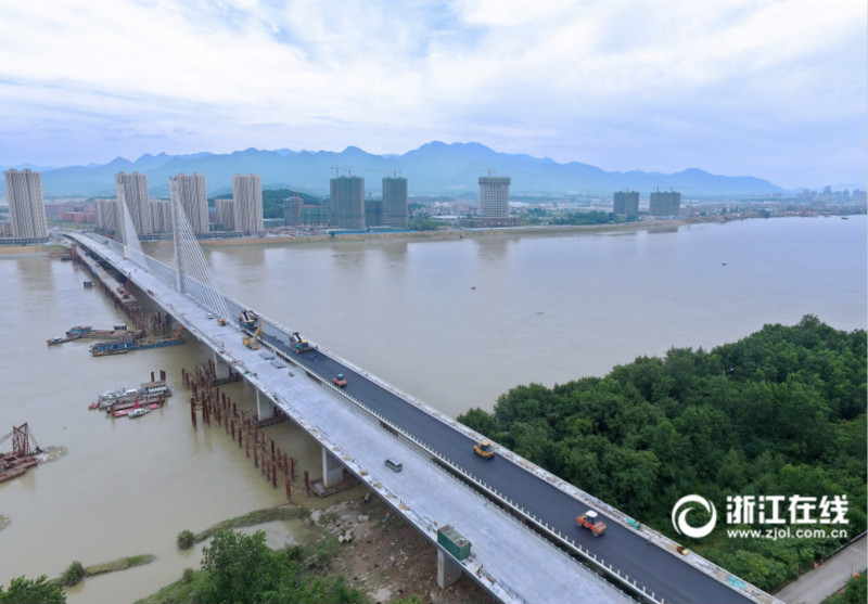 6月18日,橫跨桐廬富春江的柴埠大橋進(jìn)入路面鋪設(shè)階段。經(jīng)過(guò)兩年多建設(shè),該大橋南北貫通,雄姿顯現(xiàn)。柴埠大橋設(shè)計(jì)為雙塔中央索面預(yù)應(yīng)力混凝土斜拉橋,全長(zhǎng)1315.7米,橋?qū)?4.3米,雙向六車道,設(shè)計(jì)速度80公里每小時(shí) ,預(yù)計(jì)今年10月竣工通車。 (記者 吳元峰 攝)