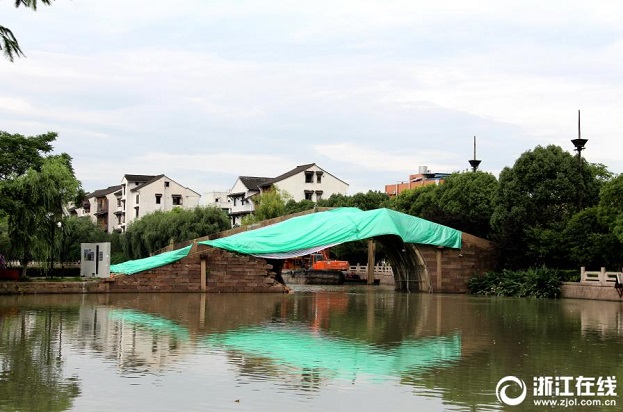 7月9日,杭州上塘河古橋歡喜永寧橋披上了“雨披”,做好防雨措施,防止大雨再次來襲時引發(fā)二次坍塌,準(zhǔn)備修復(fù)施工的設(shè)備船已經(jīng)?吭诠艠蜻吷。(浙江在線拍友 柱子 攝)