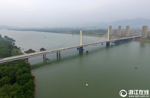 8月6日,桐廬富春江柴埠大橋已進入橋面鋪設階段。大橋主橋設計為雙塔中央索面預應力混凝土斜拉橋,全長1315.7米,雙向六車道,設計時速80公里,計劃10月通車。 (浙江在線記者 吳元峰 攝)