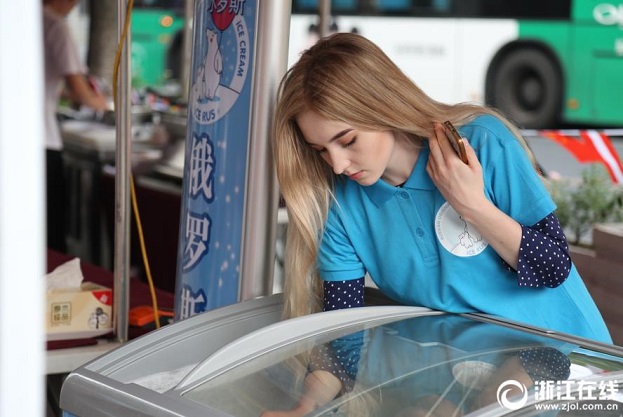 9月5日,杭州武林夜市出現(xiàn)了一位練攤賣冰激凌的俄羅斯美女,吸引了不少客流,大家都夸她長得像洋娃娃。據(jù)悉,妹子叫吉安娜,來自俄羅斯,現(xiàn)在就讀浙江科技學院商務(wù)漢語專業(yè),當天是去幫助好朋友賣冰激凌的。(浙江在線拍友 朱衛(wèi)國 攝)