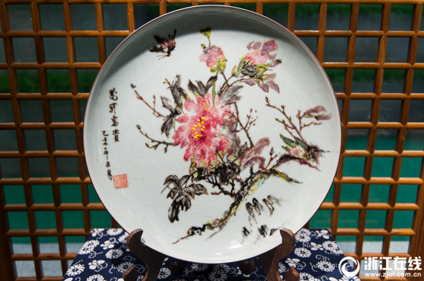 非遺傳承人沈登驥老人的瓷板畫在浙江省非物質(zhì)文化遺產(chǎn)文獻(xiàn)館展出。此次展出的40多件作品均是沈登驥老人用在傳統(tǒng)工藝的基礎(chǔ)上研發(fā)而成的“釉上彩免燒工藝”創(chuàng)作而成。(記者 陳嘉昀 攝)