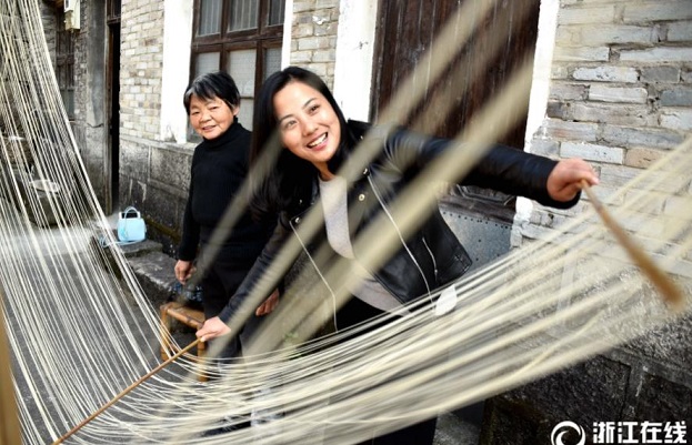 2017年12月10日,仙居縣朱溪鎮(zhèn)溪上村農(nóng)民在晾曬索面。冬閑時節(jié),當?shù)卮迕駠@“一村一品、一鎮(zhèn)一業(yè)”,大力開展冬季創(chuàng)業(yè)增收,到處是“冬閑人不閑”的忙碌景象。(拍友 王華斌 攝)