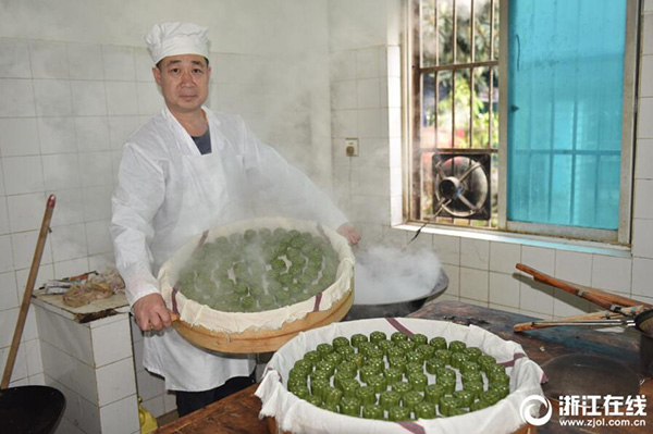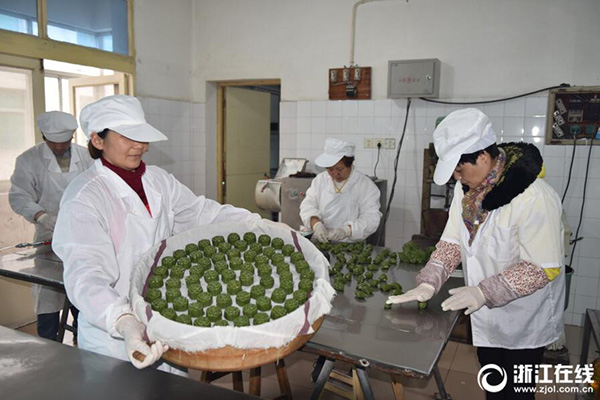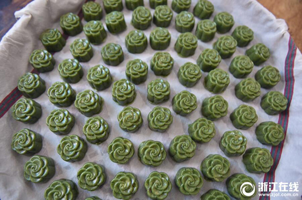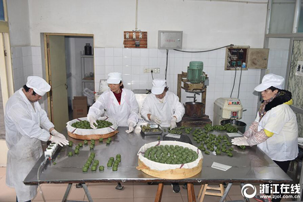 3月19日,金華婺城區(qū)糖古糕點坊的制作師傅們正在趕制傳統(tǒng)民間清明粿。