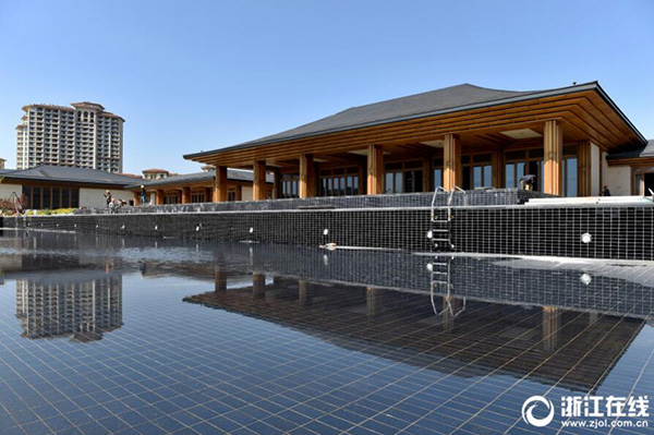 被譽為“舟山最美會客廳”的國際海島旅游大會永久會址位于朱家尖,今年8月將開出海上絲綢之路酒店。這家投資10億元的主題酒店,客房融入了“海上絲綢之路”沿途的中國江南、東南亞、中東、地中海四種建筑風格和異域風情,今年9月將承接國際油商大會,首批員工正加緊培訓。(記者 潘海松 攝)