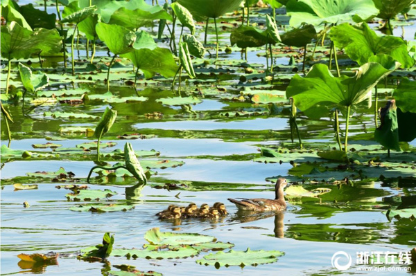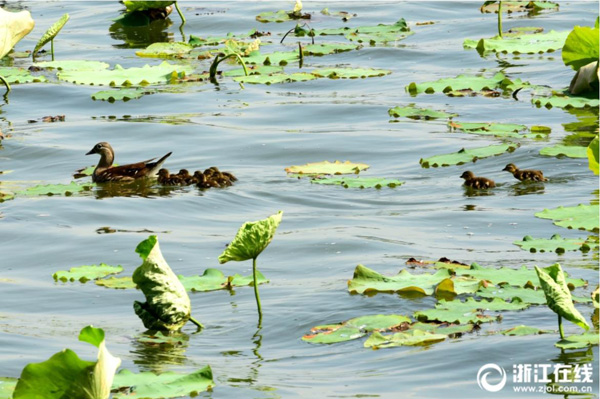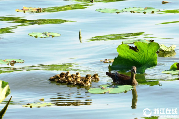 5月15日,西湖斷橋荷塘出現了今年第4窩小鴛鴦,此次共10只。