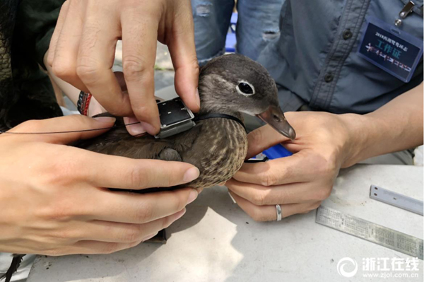 6月21日,杭州孤山畔,全國鳥類環(huán)志中心的專家給西湖里的小鴛鴦戴上能辨識身份的腳環(huán)和GPS衛(wèi)星跟蹤儀。