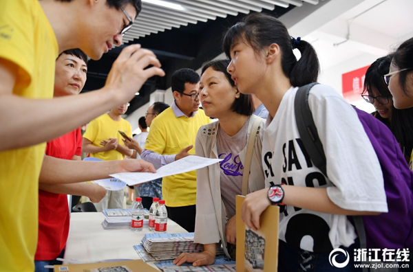 6月24日,浙江大學(xué)在紫金港校區(qū)舉辦校園開(kāi)放日。全校30余個(gè)院系的一線師生在現(xiàn)場(chǎng)為廣大考生和家長(zhǎng)解答專業(yè)問(wèn)題。同時(shí)還有多所985、“雙一流”高校的招生辦老師為考生填報(bào)志愿提供參考意見(jiàn)。(記者 董旭明 攝)