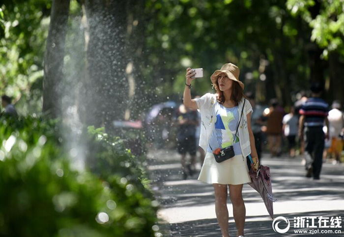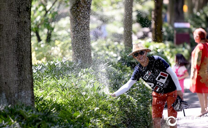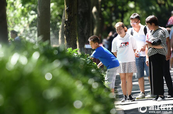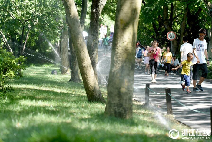 7月18日,杭州入伏后,持續(xù)高溫。在西湖蘇堤,園林工人開啟綠化帶中的噴淋裝置,給驕陽(yáng)下“喊渴”的植物澆水,也給熱浪中的游客帶來(lái)絲絲清涼。