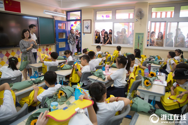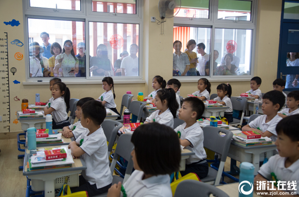 9月2日,杭州長江實驗小學開學,一年級生迎來小學第一堂課。教室內(nèi)小朋友認真聽課,教室外窗口門框邊倚靠著很多圍觀家長。爺爺奶奶爸爸媽媽齊刷刷地簇擁在教室外觀望,時而拿出手機記錄孩子們的人生第一課。