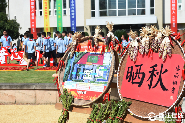 9月2日,杭州富陽區(qū)富春第七小學(xué)別出心裁,用“曬秋”的形式迎接新學(xué)期開學(xué)。菁菁校園里,果實(shí)累累,隨處可見用紅辣椒、大蒜、玉米、南瓜等果實(shí)拼成的圖案,這些圖形特別醒目,創(chuàng)意感十足。這些果實(shí)都是由學(xué)生、老師和家長在富春七小開心農(nóng)場親手栽種收獲的。學(xué)校通過“曬秋”的形式,既曬出了大家的喜悅,也讓孩子們懂得勞動(dòng)的意義。