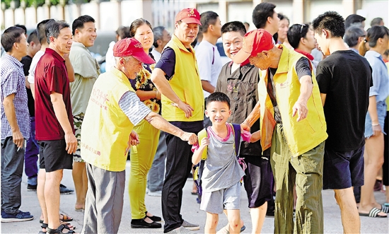 9月4日傍晚,桐廬縣鳳川小學(xué)校門口,由退休黨員組成的“校門爺爺”護(hù)童隊(duì)在義務(wù)護(hù)送小學(xué)生放學(xué)。據(jù)了解,鳳川小學(xué)校門口是一條縣級公路,路況復(fù)雜。一些退休黨員自愿成立“校門爺爺”護(hù)童隊(duì),5年來風(fēng)雨無阻守護(hù)孩子們的安全。