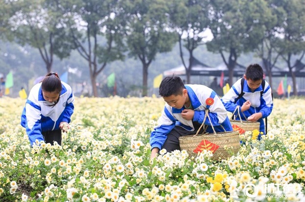 11月4日,桐鄉(xiāng)市石門鎮(zhèn),不少家長帶著孩子在白馬塘村的菊海里挎著竹籃,體驗杭白菊采摘。