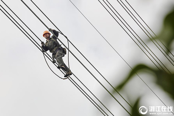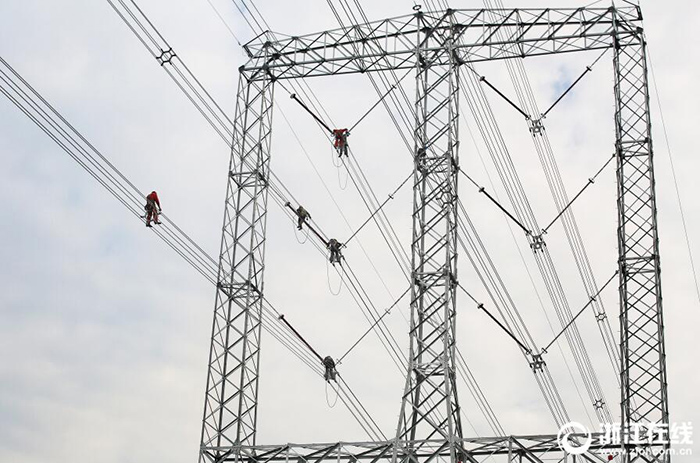 11月13日,位于杭州德勝快速路旁數(shù)十米高的超高壓電線上,幾位走線員正在驗(yàn)收500千伏艮山變送入輸電線路。